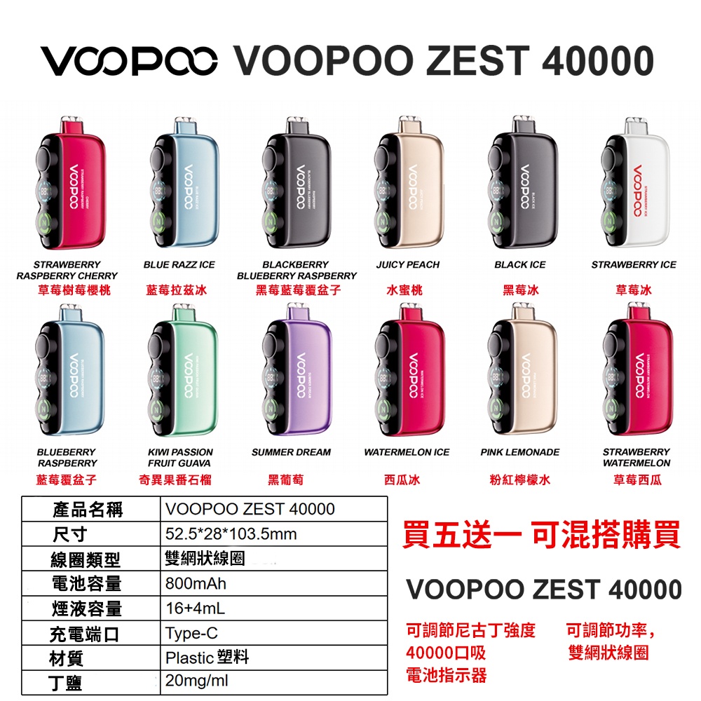 VOOPOO ZESTVOOPOO ZEST 40000口 20ml 超大容量一次性拋棄式電子煙 買五送一