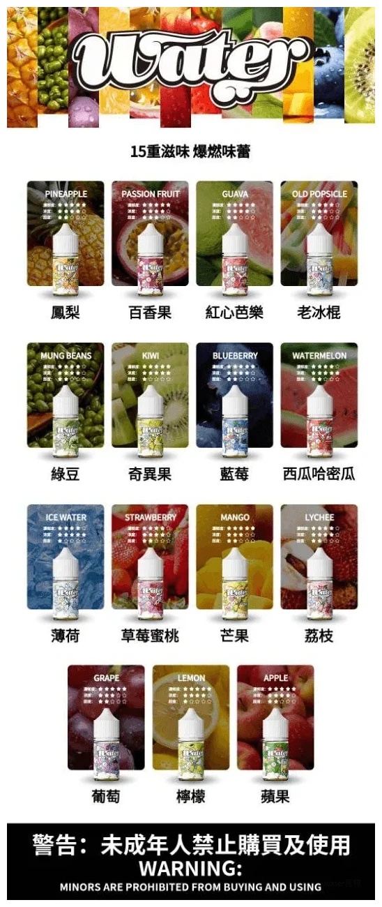 冰泉薄荷, 奇異果, 檸檬, 百香果, 紅心芭樂, 綠豆, 老冰棍, 芒果, 草莓蜜桃, 荔枝, 葡萄, 藍莓, 西瓜哈密瓜, 青蘋果, 鳳梨